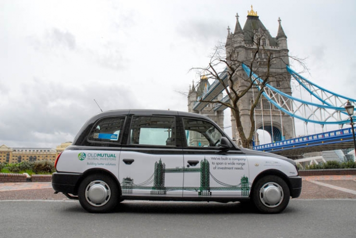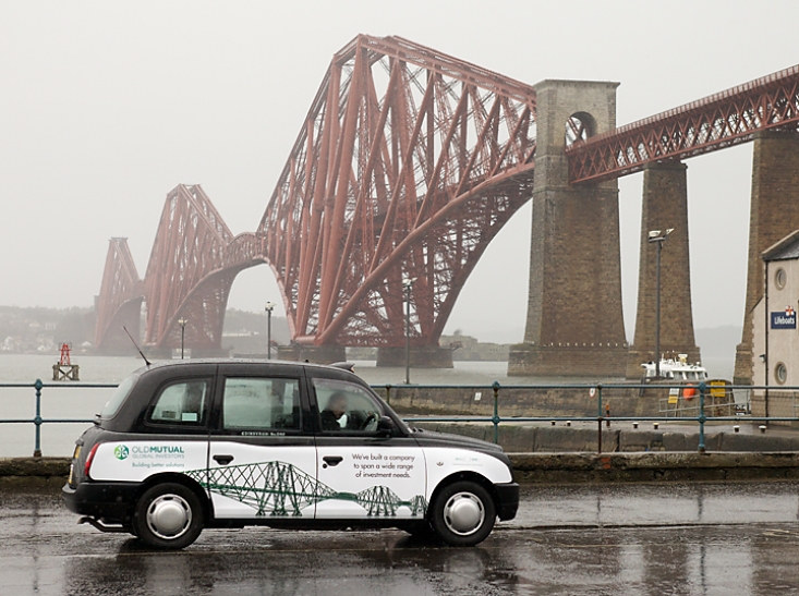 The forth bridge on the side of a taxi